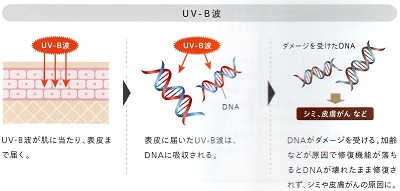 ・表皮細胞に届き肌を黒くする。またDNAを傷つけシミやシワ、皮膚がんの原因になる。