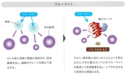 ・紫外線を浴びた肌は酸化タンパクという物質ができ、酸化タンパクにブルーライトが吸収されると活性酸素が発生し、皮膚老化の要因になる。単体で浴びても悪影響があるので、肌にとってメリットはないと言えます。