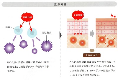 ・UV-Aよりも奥深く届く。そのため皮膚組織全体まで影響を与え、エネルギー量によっては、良くも悪くも作用する。
