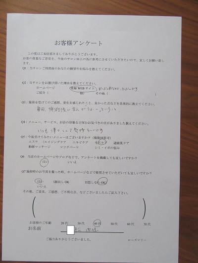 余談ですが、私、ご主人から絶大な信頼を受けているようでして、奥様の体調が元気でいれるのも、シミを消してくれるのも、お肌をきれいにしてくれるのも、ローズマリーならと思ってくださっているのが、お客様(妻)のお話から伝わってくるので、私はとっても嬉しいです。