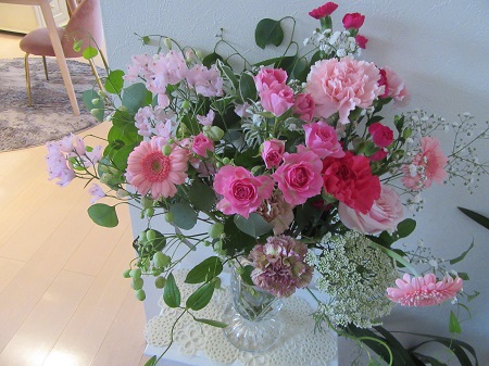 偶然にもピンク系ですし、合わせて生ければより華やかになると思い、