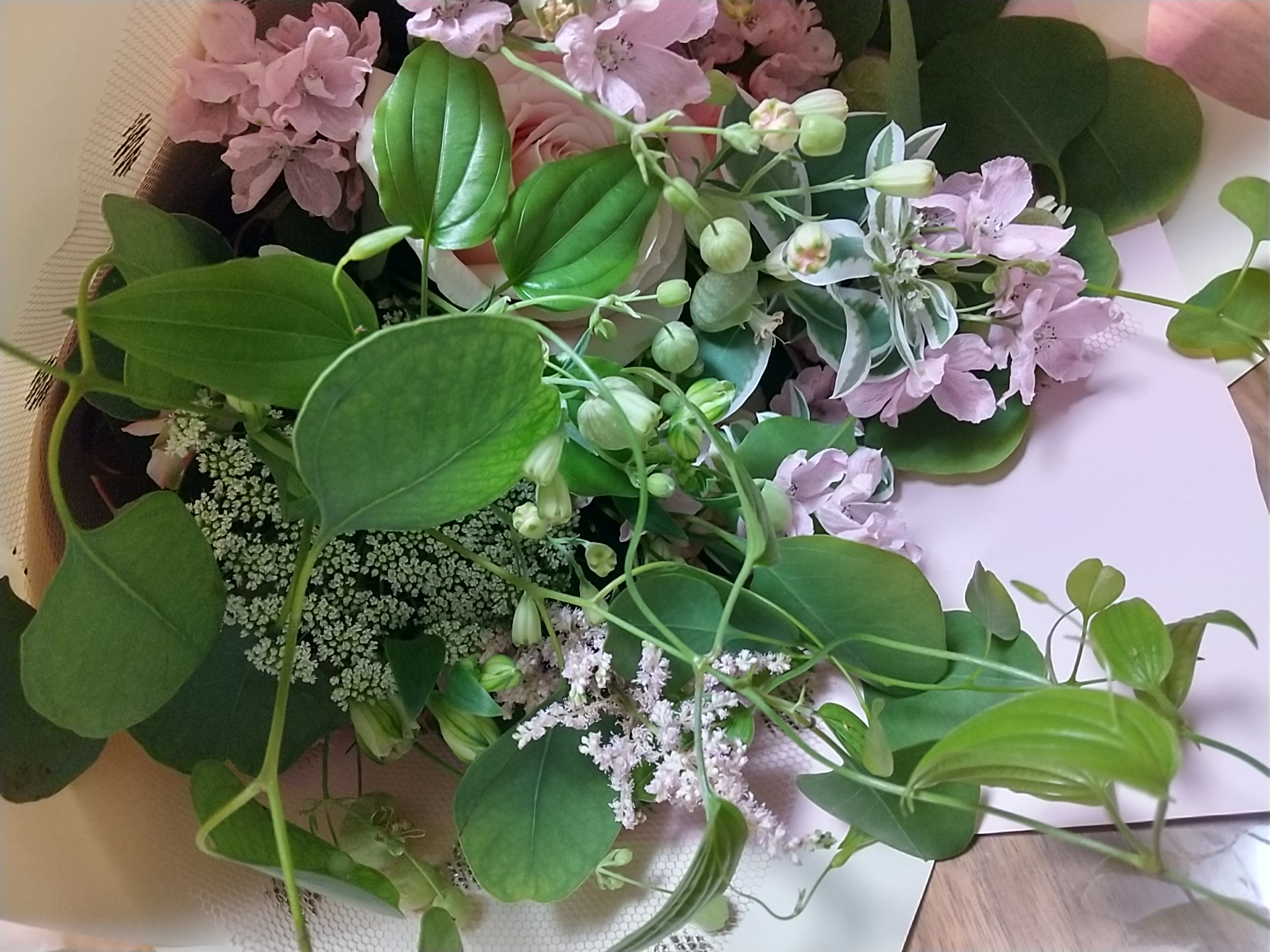 レースフラワーが入ってて、薄ピンクと薄紫の色合いが可憐で素敵です。
