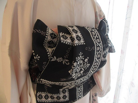 お着物の格にこの帯はカジュアルですし、ましてこの帯結びでは叱られるかと思いますが、お客様がこのマネ子ちゃんを見て、心が和んで頂ければ、目で楽しんで頂ければと思って、可愛い帯結びにしました。