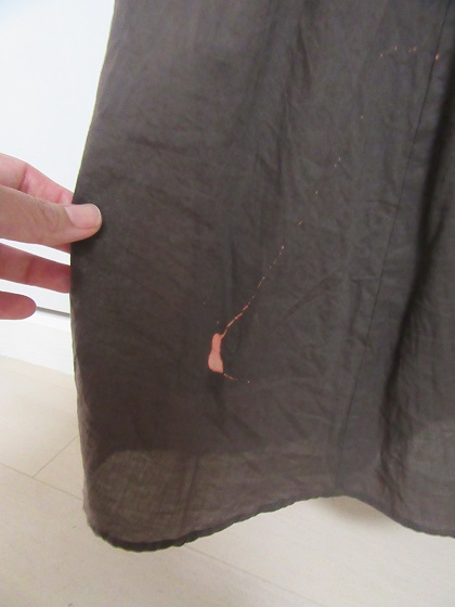 買ったばかりのスカートをはいてお風呂で塩素系洗剤をシュッシュッしていたら、かからないように気をつけていたのに、何故か自分の洋服にもかかってしまい、気付いたらオレンジ色になってしまっていたんです。
