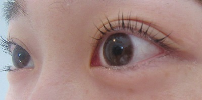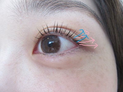 今回の流し目仕上げは、ピンクラインで示したように、目尻のマツゲが外側に流れています。