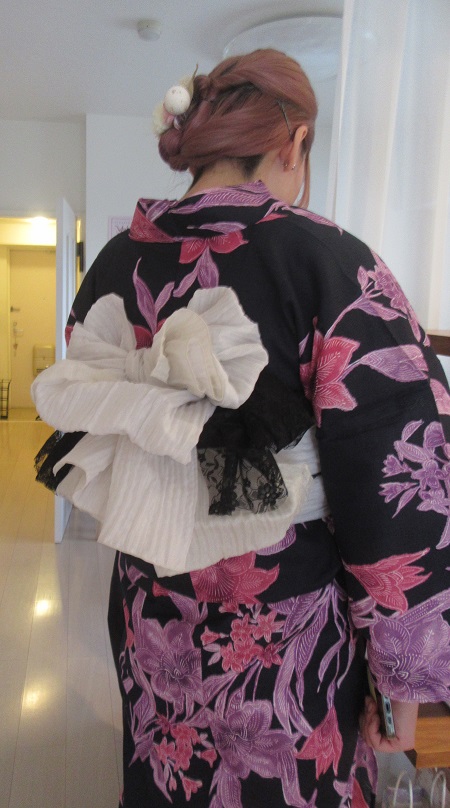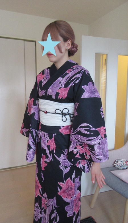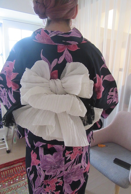 ウエストがとても細くて骨盤との差が結構ある体型だったので、補正を結構入れて着付けさせて頂きました。
