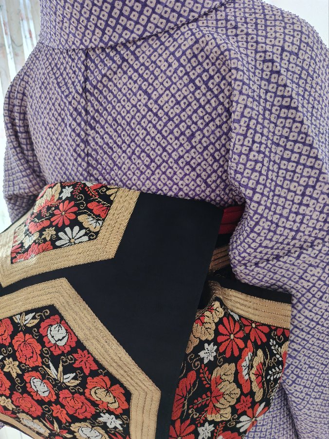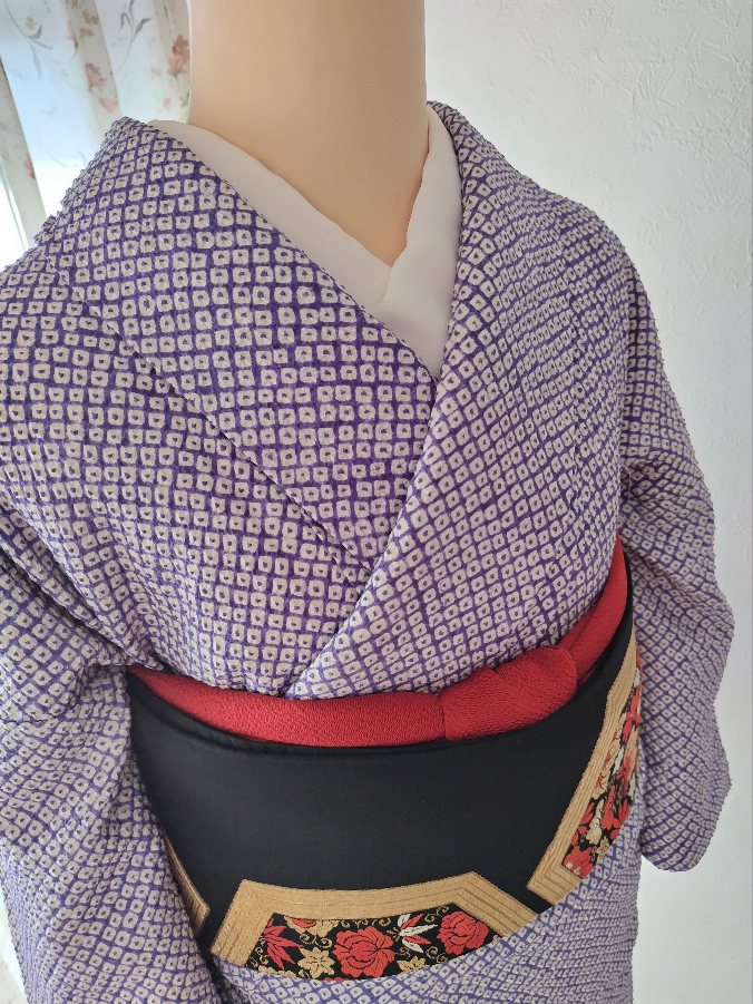 お着物は紫色の総絞り、絞りのお着物は厚みがあるというか、太って見えそうな感じがするので、なかなか着ようってなりませんでした。