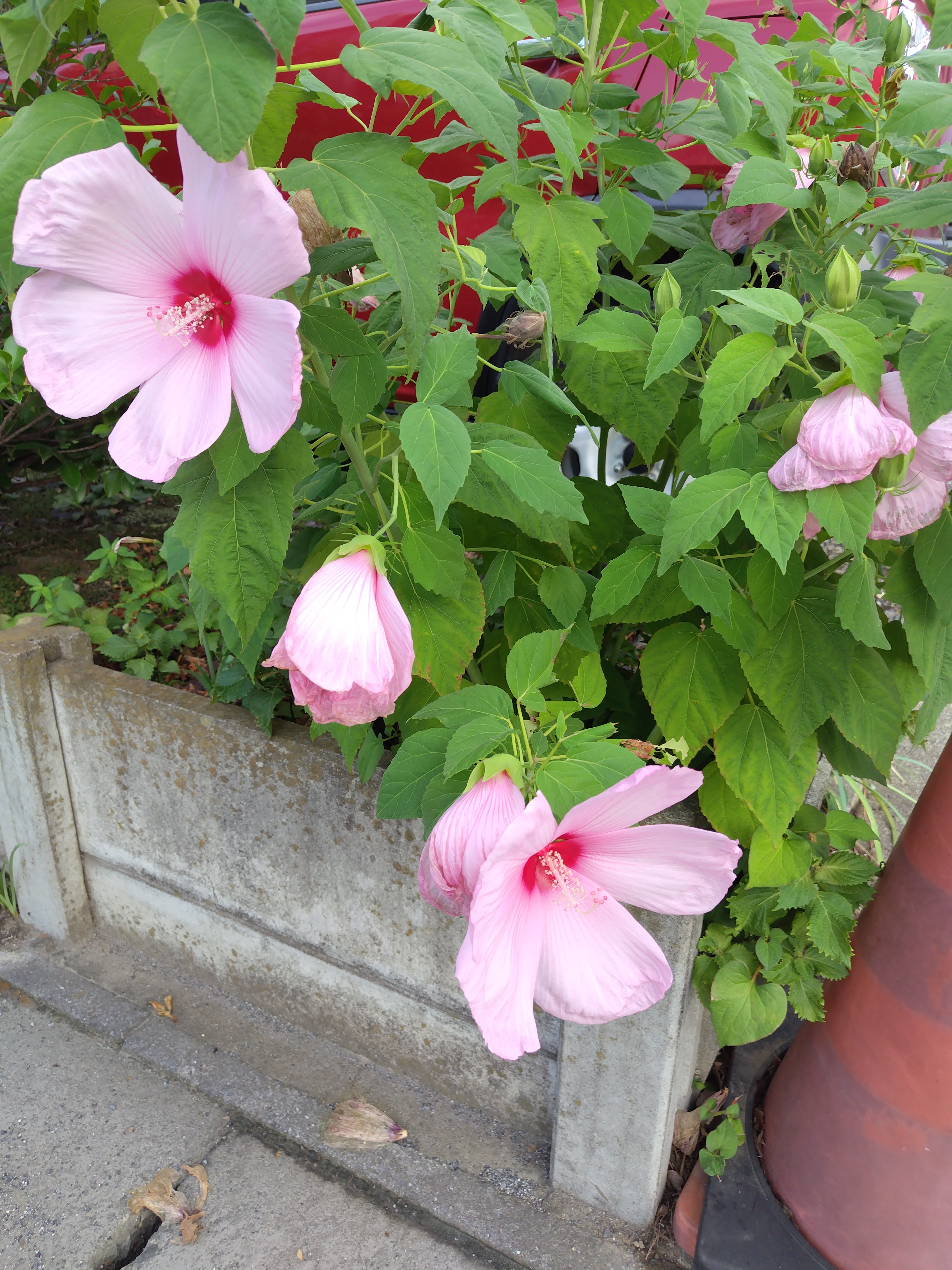 毎朝の散歩道で、ハイビスカスを大きく大きくした、きれい〜なピンク色の花が咲いていました。